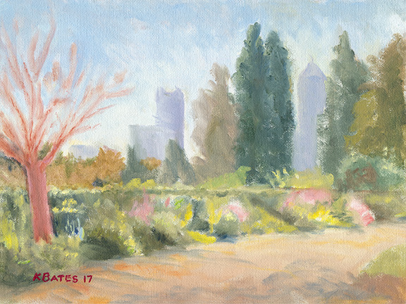 This painting of the Atlanta Botanical Garden was done en plein air at the change of seasons from late summer into early fall. It shows