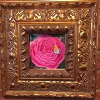 Original watercolor of a Double Pink Camellia with Bronze Copper Butterfly in an Ornate Gold Frame